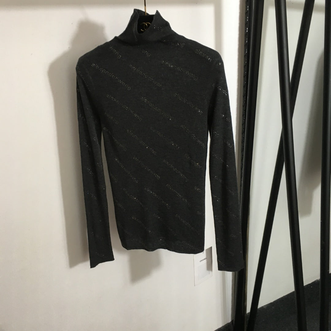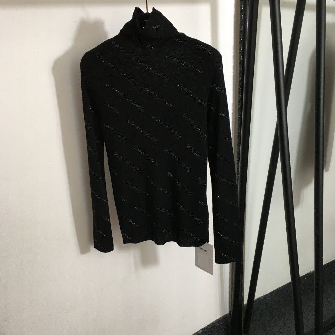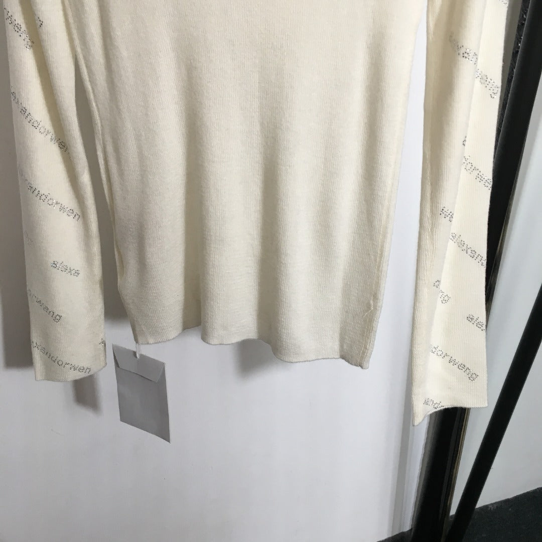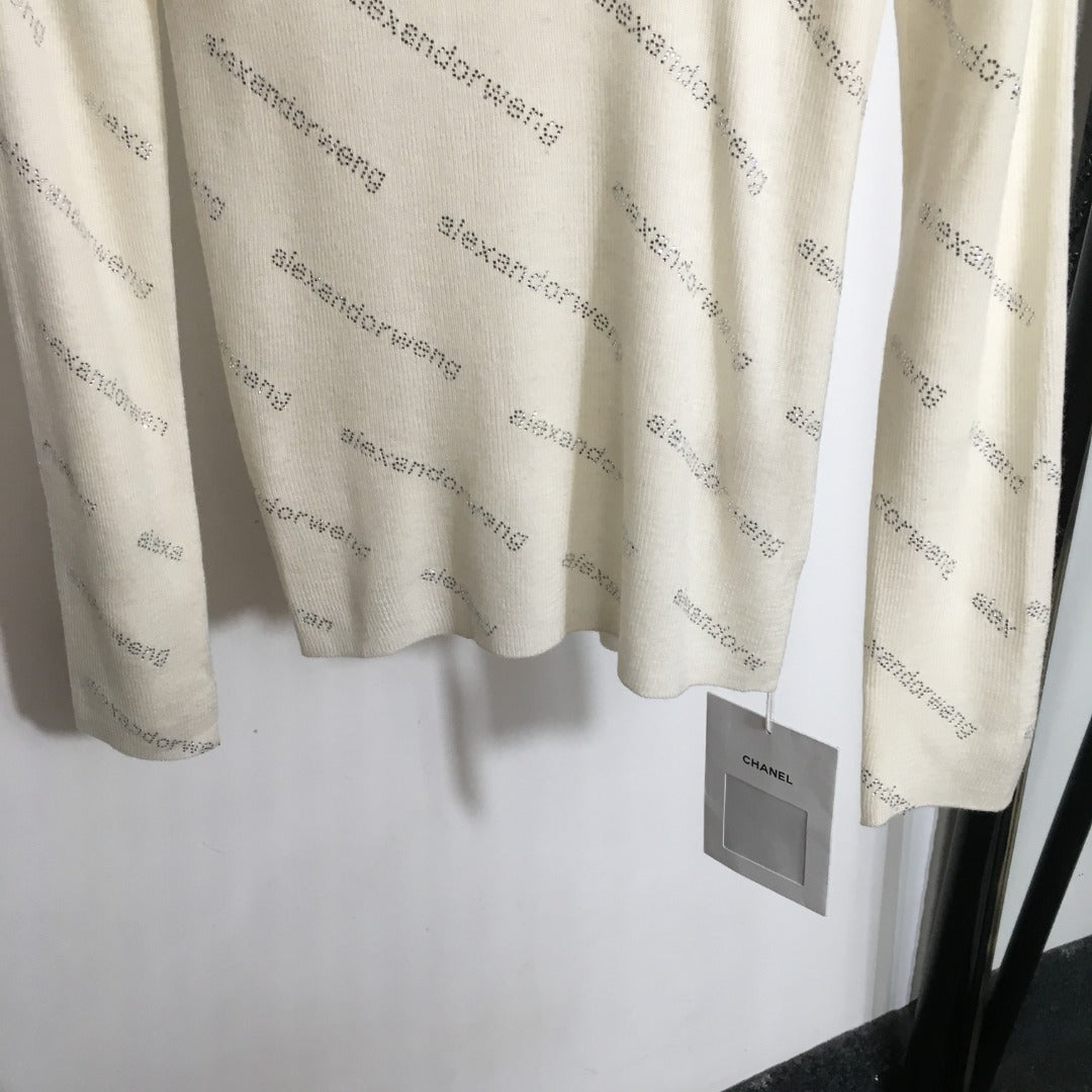 AW logo rhinestone lettering high collar long sleeve wool sweater